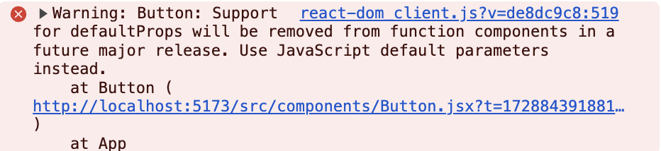 Button.defaultProps 를 사용해서 default 값을 설정해주었더니 에러는 나지 않지만 개발자 도구로 확인해보면 아래와 같은 경고가 뜨는 것을 확인할 수 있었다.
