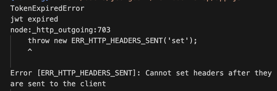 그리고 그 밑에는 ERR_HTTP_HEADERS_SENT 라는 에러를 던지고 있다. 이 에러는 토큰이 만료된 것과는 상관이 없는 에러인 것 같은데 무슨 에러이고 왜 나는걸까?