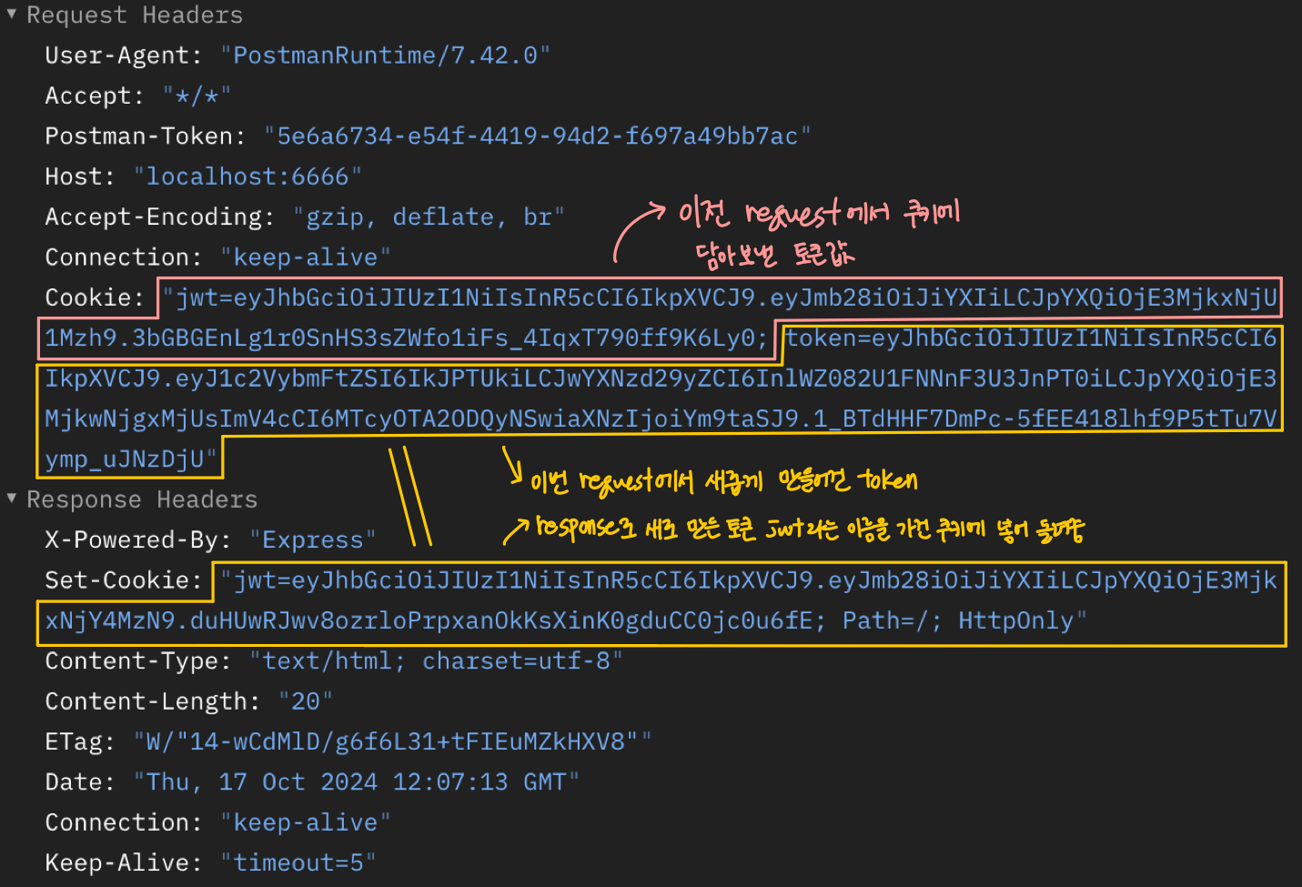 핑크색: 이전 request 에서 쿠키에 담아보낸 토큰 == 위에 사진에 있는 값과 같음