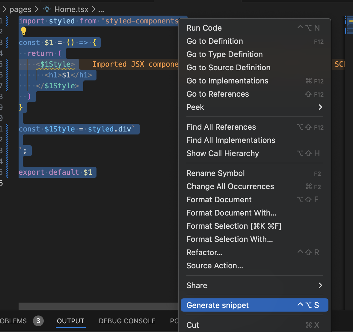 아래와 같은 코드를 만들어야 한다고 했을 때, 반복되는 부분(Home)에 $n 의 값을 넣고 드래그 한 후 마우스 우클릭을 하면 Generate snippet 이라는 옵션이 뜬다.